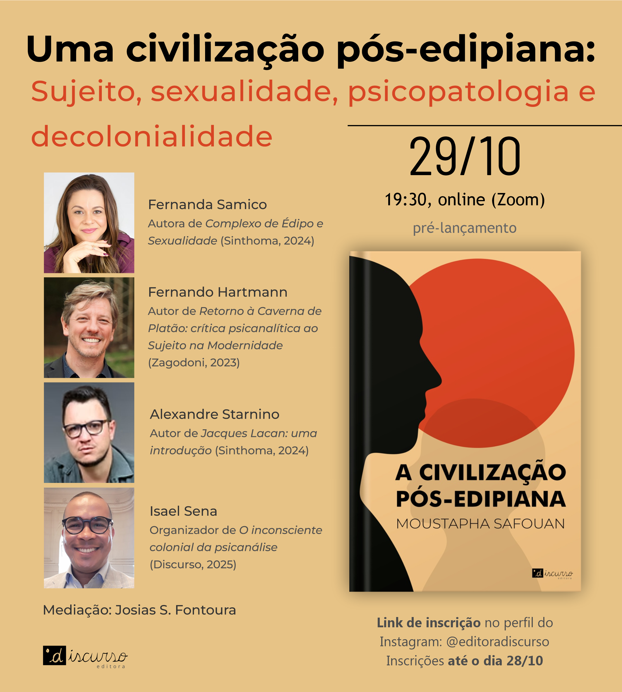 Contaremos com a presença dos convidados Fernanda Samico, Fernando Hartmann, Isael Sena e Alexandre Starnino, que estarão tecendo seus comentários a partir da proposição de Safouan sobre uma civilização pós-edipiana em sua interlocução com os tópicos Sujeito, Sexualidade, Psicopatologia e Decolonialidade.